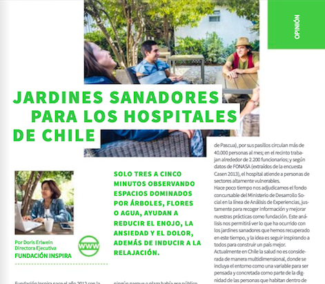 En el último número de la Revista de Metrogas, publicado recientemente destacan la columna de nuestra Directora Ejecutiva, Doris Erlwein. El texto repasa cómo Fundación Inspira llegó al Hospital del Salvador (HDS) y todo lo que ha logrado en estos cinco años respecto a los Jardines Sanadores. Además cuenta sobre el fondo que nos adjudicamos gracias al Ministerio de Desarrollo Social que nos ha permitido estudiar el impacto de estos jardines dentro del Hospital. Y es que como lo asegura la neuroinmunóloga estadounidense, Esther Sternberg: “Estar solo tres a cinco minutos observando espacios dominados por árboles, flores o agua, ayudan a reducir el enojo, la ansiedad, además de inducir a la relajación y a cambios en la presión sanguínea, tensión muscular y actividad eléctrica del corazón y cerebro”.